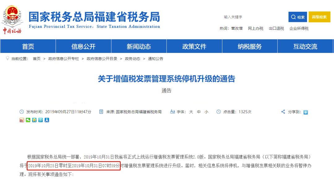 2019年10月24日0時(shí)至2019年10月31日07時(shí)59分,“福建地區(qū)增值稅發(fā)票選擇確認(rèn)平臺”暫停服務(wù)