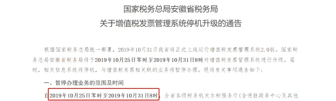 2019年10月25日零時(shí)至2019年10月31日8時(shí),“安徽地區(qū)增值稅發(fā)票選擇確認(rèn)平臺”暫停服務(wù)